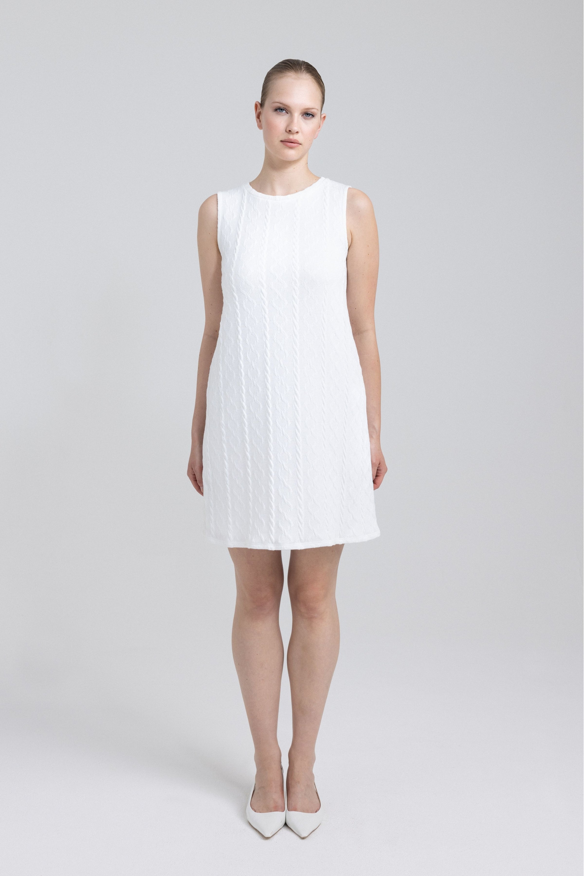 Crafted from a softly structured textured knit, STELLA features a loose, fluid fit that gently skims the body without clinging. Its clean lines and relaxed shape create an easy elegance, while the above-the-knee length keeps the look light and modern. Thanks to its straight, airy silhouette, STELLA is naturally flattering on many body shapes, creating a sense of lightness and comfort while preserving a refined look. A versatile essential, perfect worn on its own or layered with a light jacket for a refined everyday look.